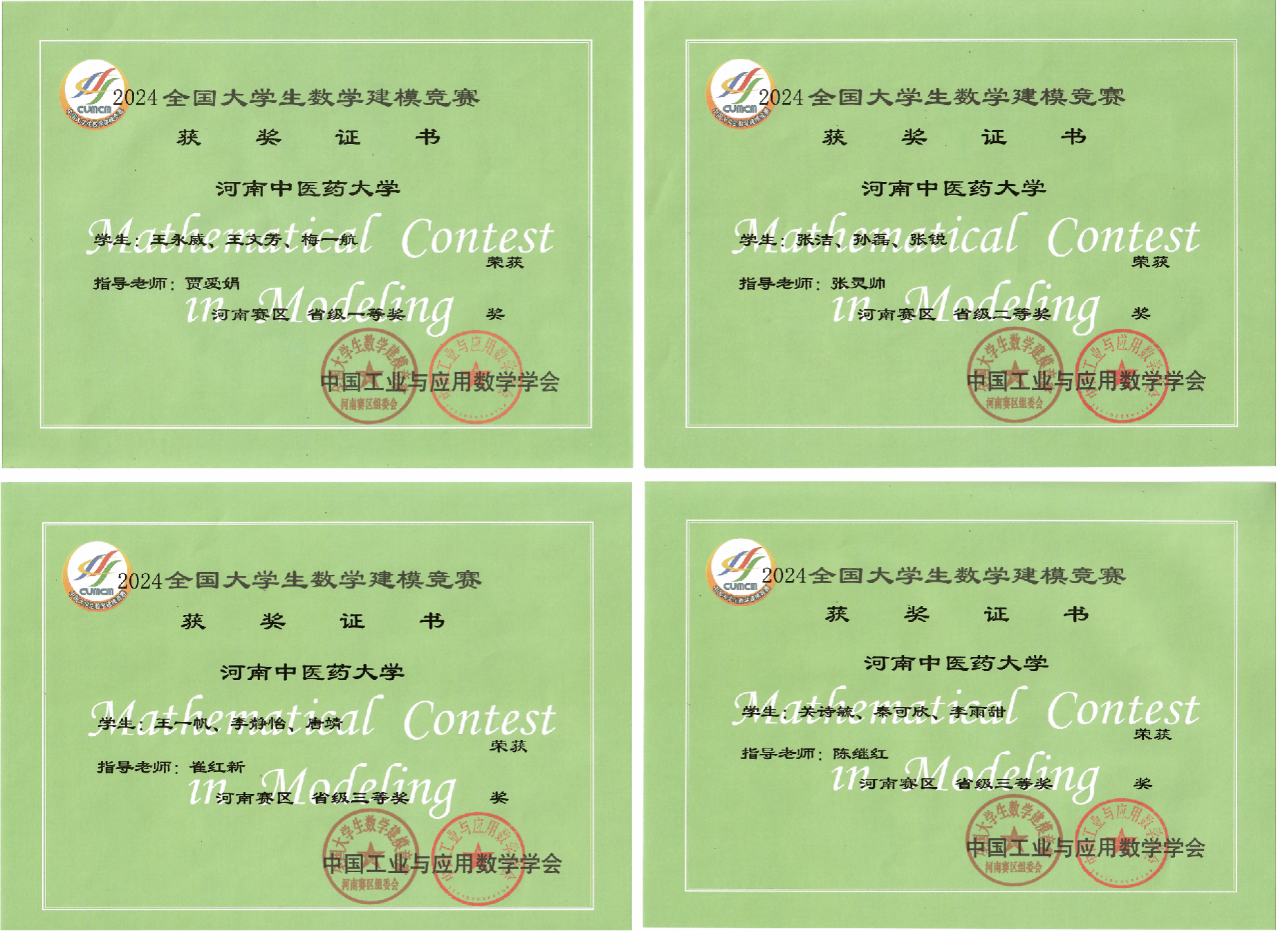 本网讯(文/图 黄琼)近日,2024年高教社杯全国大学生数学建模竞赛落下帷幕。药学院(中药制药技术与装备行业学院)数学与物理教研室教师首次组织学生参加高教社杯全国大学生数学建模竞赛,勇创佳绩。获得省级一等奖1项、二等奖1项、三等奖2项。