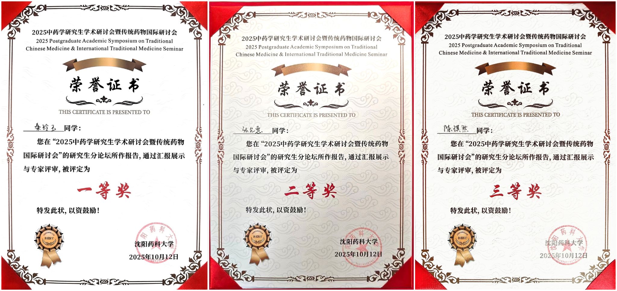 本网讯(文/袁怜悯 图/胡春月)2025年10月11日-13日“2025中药学研究生学术研讨会暨传统药物国际研讨会”在沈阳药科大学举办。为促进药学院学生了解国内外中药和传统药学领域的前沿方向,加强学术交流,并积极展示我院学生的科研成果。药学院(中药制药技术与装备行业学院)副院长方晓艳率队参加,药学院学生秦玲玉、张允惠、陈琪然通过现场评审分别获得一等奖、二等奖、三等奖。