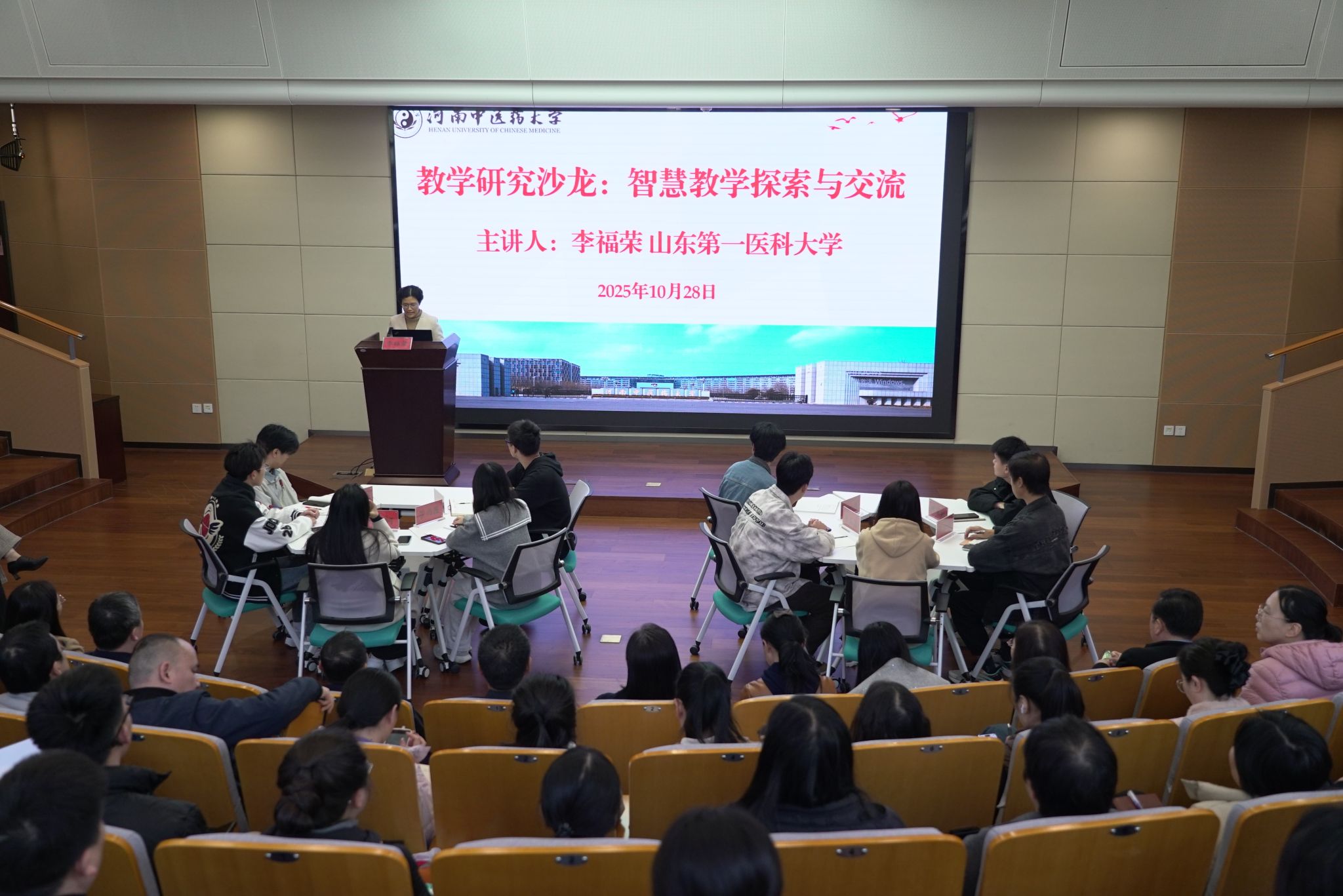 本网讯(文/纪永升 图/陶豪杰)2025年10月28日,河南中医药大学第二期教学研究沙龙活动在俊学楼A114报告厅举行。本次活动由学校教务部主办、药学院承办,特邀山东第一医科大学李福荣教授担任主讲嘉宾,教务部常务副部长禄保平、教学质量评价与教育教学研究中心主任卢旻和副主任闫秀娟、各学院教学研究分中心负责人、主管教学副院长、骨干教师及教学办人员共同参与,药学院副院长朱鑫主持活动。