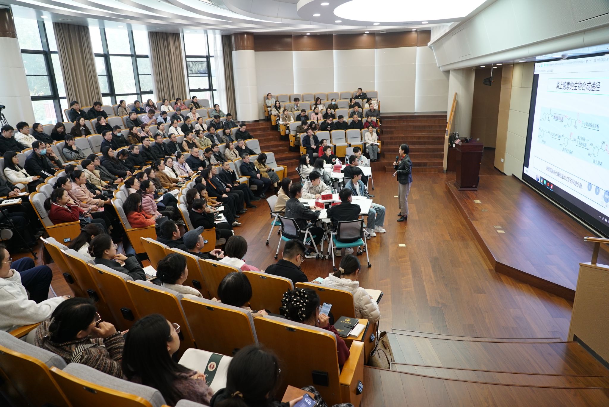 活动包括教学示范与展示交流两大环节。在教学示范环节,李福荣以“肾上腺素受体激动剂”为题开展智慧课程建设示范课。在课前创建学习班级、发布学习任务与课前测试,并依据学情数据进行AI辅助备课,精准梳理课中讨论的重点难点的基础上,她以问题为导向设计分组任务,引导学生深化对教学重难点的理解,同时巧妙融入课程思政元素,生动呈现智慧教学场景搭建思路与模式。课后,同步发布了作业与拓展学习任务的及反馈安排,完整展示了智慧教学全流程。在展示交流环节,李福荣从智慧课程课堂教学总体设计角度出发,通过“课前学情分析—课中问题引导—课后拓展反馈”的闭环设计,生动呈现了智慧教学工具与人工智能技术在专业核心课程中的深度应用,尤其是以问题为导向的分组任务设计,不仅有效突破了教学重难点,更巧妙设计了课程思政效果的评价,为大家提供了可借鉴的智慧教学实践范例。随后,参会教师围绕AI对课堂学习的冲击、学生评教对任课教师的影响、智慧课程设计难点等议题展开深入交流,现场研讨氛围热烈,参会教师纷纷表示受益颇丰。