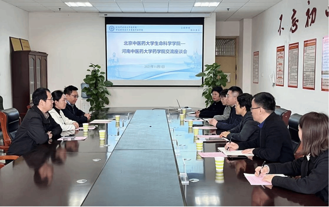 本网讯(文/图 管佳宁)为进一步促进两校之间的学术交流与合作,加强人才培养、科研教学资源共享,2025年11月3日,北京中医药大学生命科学学院党委副书记许珊、副院长马文福、就业专员王利一行三人到我校药学院进行访问交流。药学院院执行院长雷敬卫,副院长朱鑫、方晓艳、刘瑞新,办公室主任代丽萍,中药药剂学与药剂学教研室青年教师、北京中医药大学生命科学学院优秀毕业生刘洋参加此次座谈。座谈会由雷敬卫主持。