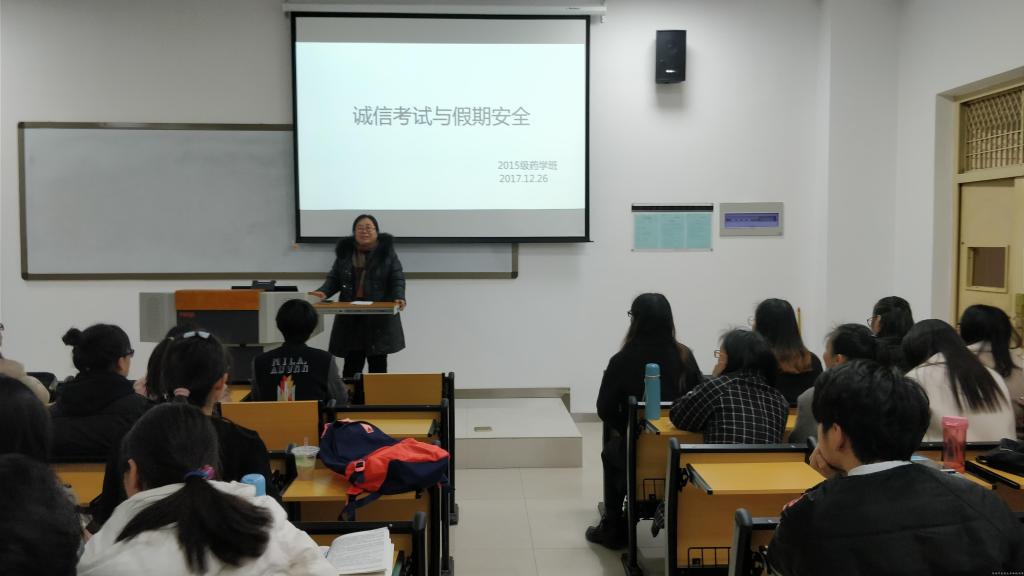 树道德之新风,立诚信之根基。为了加强大学生诚信考试观念,保证学生在考试周顺利考试并度过一个安全、愉快的寒假,药学院在2018年1月8~12日期间举行诚信考试及假期安全教育班会。药学院2015、2016、2017级各班辅导员、班主任及全体学生参加了会议。