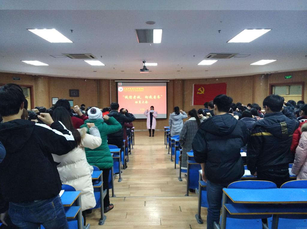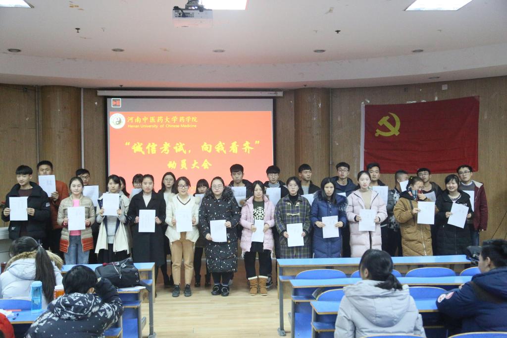 为加强药学院学生的诚信考试观念,进一步强化考风考纪,药学院分团委于2018年1月9日晚六点在教学楼A1多功能厅召开了“诚信考试,向我看齐”动员大会,药学院2015、2016、2017级全体班干部、正式党员、预备党员以及入党积极分子参加了本次大会。